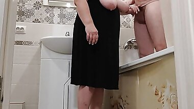 "Stepmom got excited when she jerked off his cock in the bathroom and gave a blowjob before she asked to fuck her"