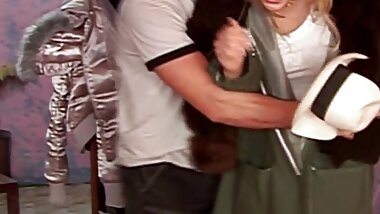 "Crazy sex in the prison. A sexy brunette with many boobs gets fucked hard by a butcher"