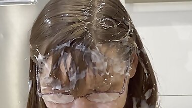 "An amazing blonde MILF enjoy warm cum on her natural tits"