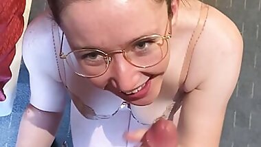 "Beautiful blonde teen gets her sexy glasses covered with cum"