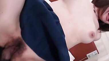 "During her interview a brunette Japanese girl gets her hairy pussy eaten out and cums"