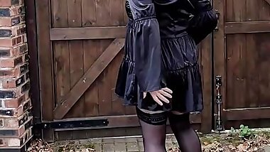 "A sissy Mature CD whoring on the streets in the daylight wearing Lingerie heels panties short skirt"