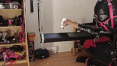 "Sissy Maid Self Bondage Gas Mask Armbinder in Chastity and Ballet Boots"
