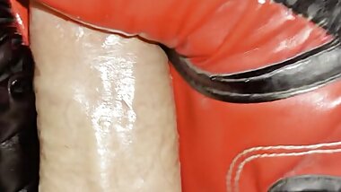 "Handjob and cum in leggings and boots"