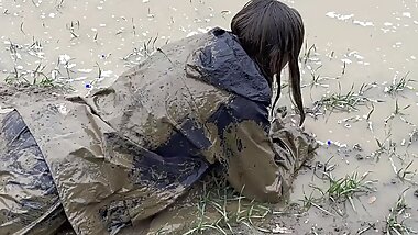 "Muddy fields, rain suit in the rain"