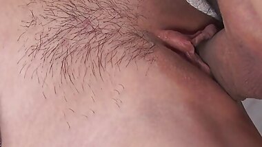 "beautiful woman with big breasts. She is Japanese with black hair. Creampie sex with blowjob and shaved pussy"